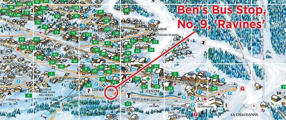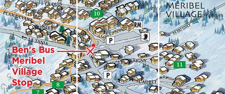 At the bus shelter, with the yellow post box on it on the roundabout in Meribel Village. See our Meribel Village stop on googlemaps